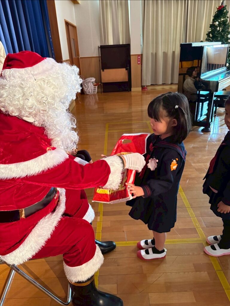 ここでサンタさんに質問ターイム!サンタさんに聞いてみたいこと聞いてみました!👧🏻「好きな食べ物は?」🎅「シチュー」👧🏻「好きな飲み物は?」🎅「ビール🍻」👧🏻「好きなお菓子は?」🎅「チーズケーキ」👧🏻「何歳ですか?」🎅「200歳!!」サンタさんの歳のとり方はみんなと違うんですって😳沢山の質問に答えてもらったらお待ちかねのプレゼントタイム🎁…あれ?サンタさんプレゼントの袋忘れてるー💦困っていると優しい優しい先生が見つけて持ってきてくれました🥹よかった🤭1人ずつ握手をしてからプレゼントをもらいました🎁