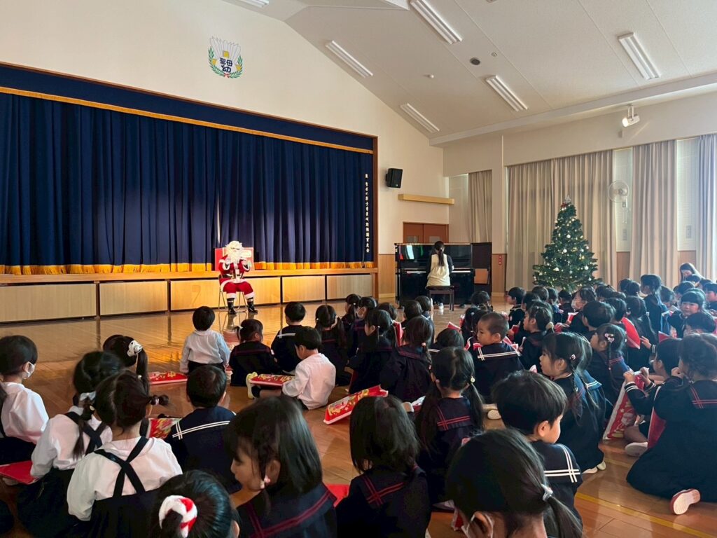 ホールに集まるとなんと‼️先生の携帯にサンタさんから電話が☎☏「もうすぐ着くから待っててね✋」と…🤩子ども達のキラキラした眼差しがとても眩しくて(*´﹀`*)✨到着までに少し時間がかかるからまずは1つ目のプレゼント🎁❤️