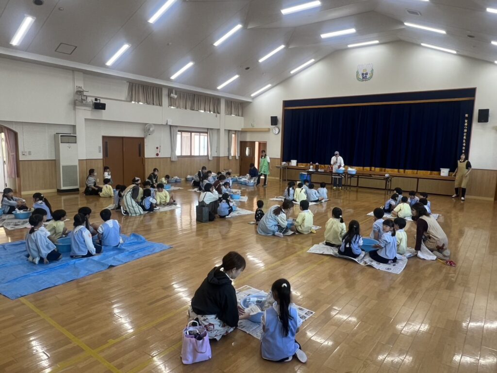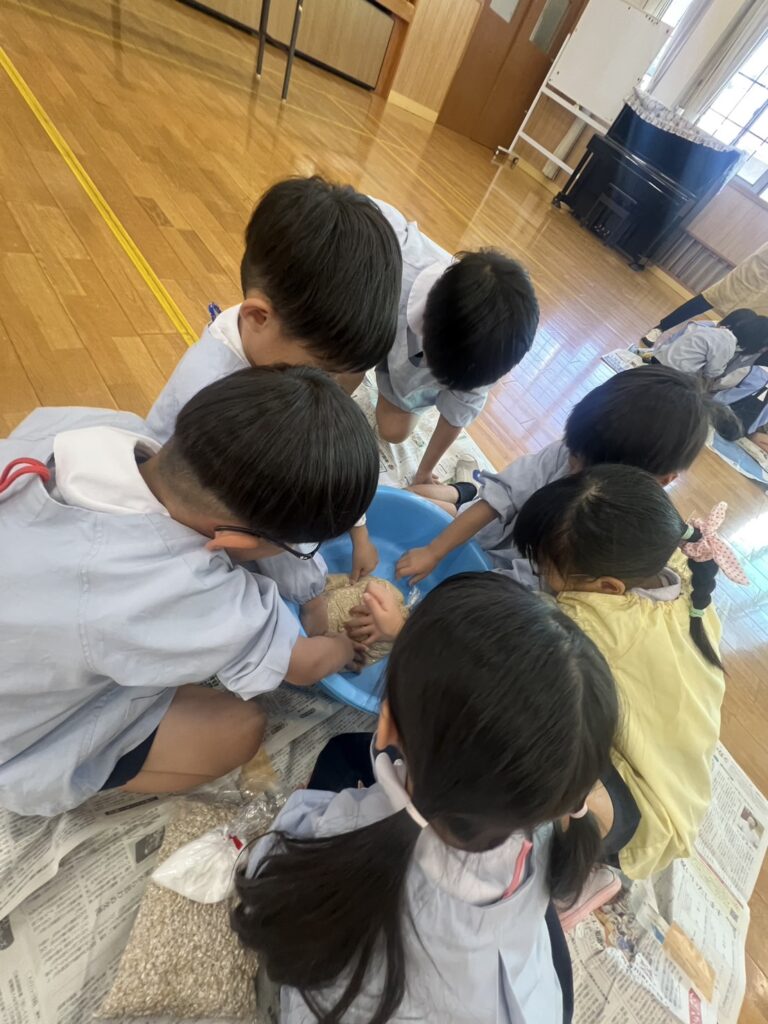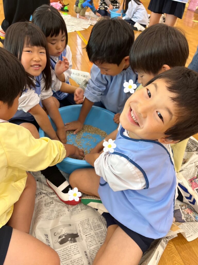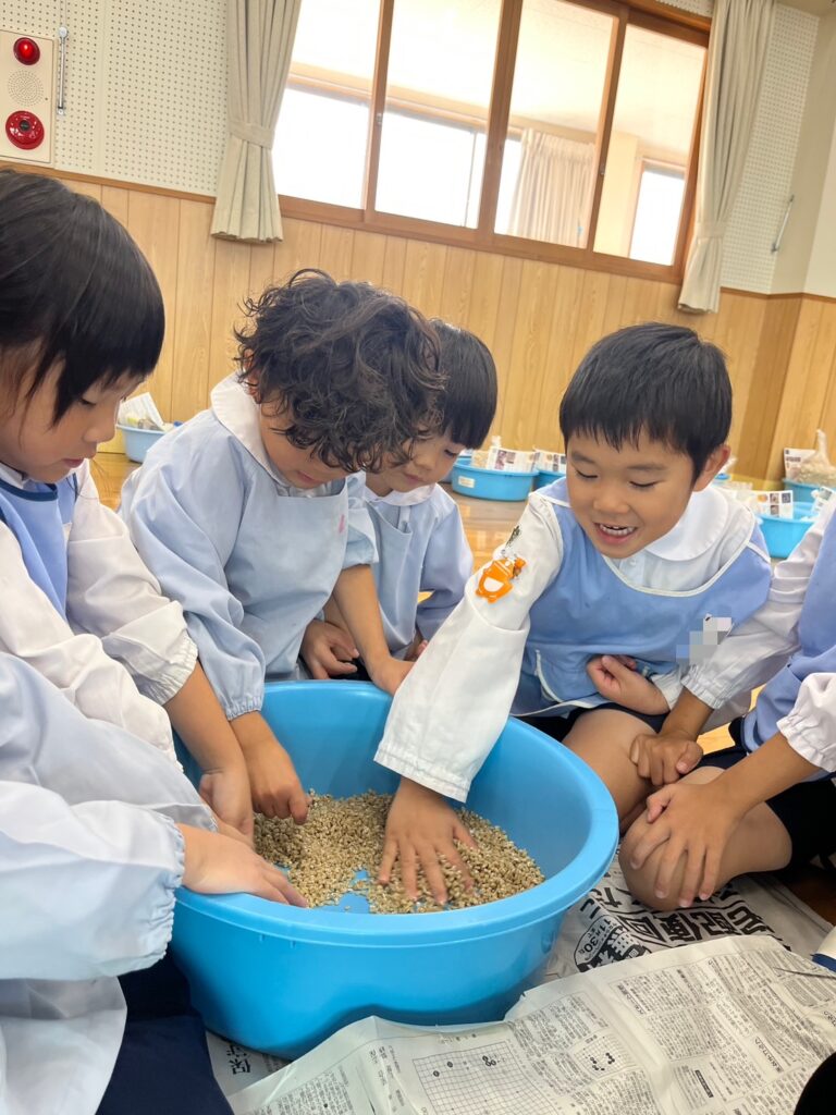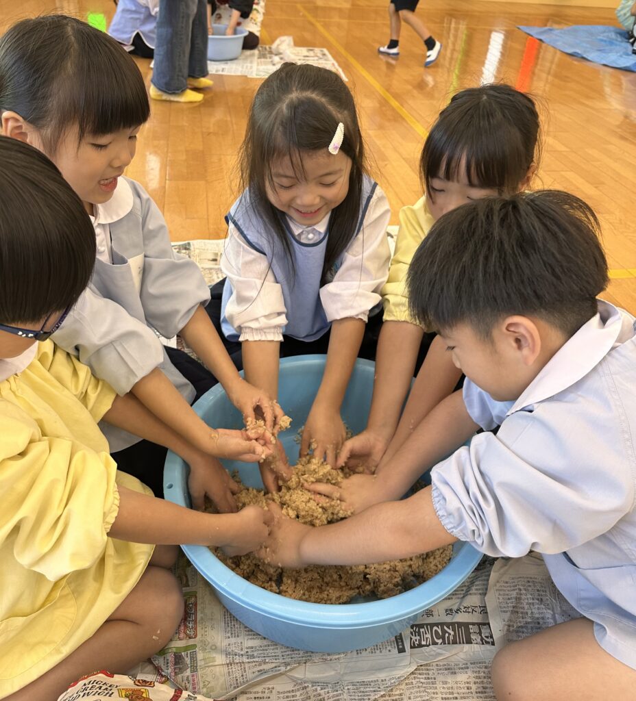 11月6日(木)、川添酢蔵さんに美味しい味噌の作り方を教えていただき、年長さんで味噌作りを行いました♩